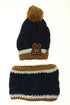 Bonnet avec pompon, revers, lettre en éponge appliquée, torsades, tour de cou assorti, doublure polaire, torsades.