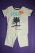 Tee-shirt sérigraphié, bermuda en jean blanc, taille réglable, fermeture éclair et pression, 8 poches, à signaler une tache sur le tee-shirt.