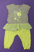 Ensemble souple, tee-shirt revers aux manches, sérigraphie, pressions dans le cou, volant en dentelle, sarouhel, taille et chevilles resserrées.