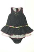 Robe sans manches, entièrement fermée par pressions dans le dos, volant, perles et sequins, bloomer assorti, taille et cuisses élastiques.