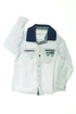Col polo plat, 2 poches poitrine, poignets boutonnés, écussons, manches retroussables.