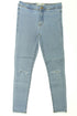 Taille ajustable, fermeture éclair et bouton, 2 poches, troué aux genoux, chevilles effrangées, coupe skinny.