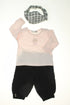 Pantalon molletonné, taille élastique, chevilles élastiques avec boutons décoratifs, tee-shirt manches longues, pressions aux épaules, sérigraphie, fichu à carreaux, élastiqué dans la nuque.