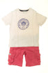 Bermuda, taille ajustable, fermeture éclair et crochet, 6 poches, tee-shirt manches courtes, sérigraphie effet vieilli d'origine.