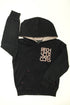 Zippé, capuche doublée, poignets et taille resserrés, 2 poches en L, sérigraphie.